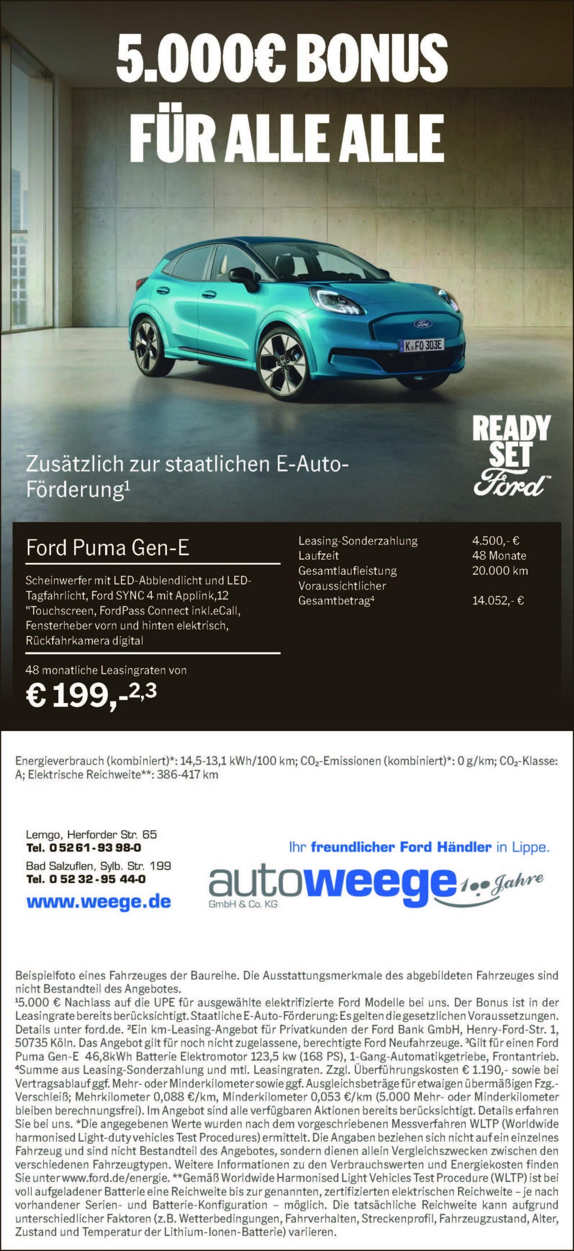 Beispielfoto von Fahrzeugen der Baureihe. Die Ausstattungsmerkmale der abgebildeten Fahrzeuge sind nicht Bestandteil des Angebotes. Ein Angebot der Ford Bank GmbH, Henry-Ford-Straße 1, 50735 Köln, für Gewerbekunden (ausgeschlossen sind Großkunden mit einem Rahmenabkommen sowie gewerbliche Sonderabnehmer z. B. Taxi, Fahrschulen, Behörden bei Neufahrzeugabschluss noch nicht zugelassene und für das jeweilige Finanzierungsangebot qualifizierte Kaufhäuser) eines Darlehensvertrages bei teilnehmenden Ford Partnern. Es gelten die Konditionen zum Zeitpunkt des Abschlusses des Darlehensvertrages. Der angebotene Zinssatz setzt zeitnahen monatlichen Abrechnungen gemäß § 17 Preisangabenverordnung dar. Das Angebot ist ein repräsentatives Beispiel nach § 17 Preisangabenverordnung. Erst der Darlehensnehmer Verbraucher berechnet nach Vertragsabschluss ein gesetzliches Widerrufsrecht gemäß § 495 BGB. Angebot gilt für einen Ford Ranger XLT Doppelkabine LKW, 3,0-l-EcoBlue-Dieselmotor 177 kW (240 PS), 10-Gang-Automatikgetriebe, e-4WD, unverbindliche Aktionspreisempfehlung Ford Werke GmbH € 50.455,75 (brutto) zzgl. Überführungs- und Zulassungskosten. Finanzierungspotential Ford Auswahl-Finanzierung, Laufleistung p. a. 10.000 km, Laufzeit 48 Monate, Anzahlung € 8.055,90, Nettodarlehensbetrag € 42.399,45, effektiver Jahreszins 0,00 %, Sollzinssatz p. a. (fest) 0,00 %, Gesamtbetrag € 42.399,45, Restlauf € 29.756,47, monatliche Raten zu je € 259,–